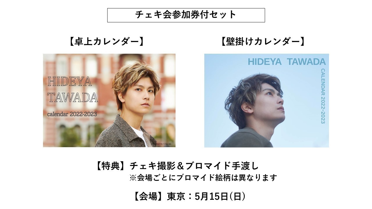 ●内容:2022年度のセパレート式A5卓上カレンダー、A4壁掛けカレンダー(見開きA3)セット(東京チェキ会参加券付、会場手渡し特典ブロマイド)