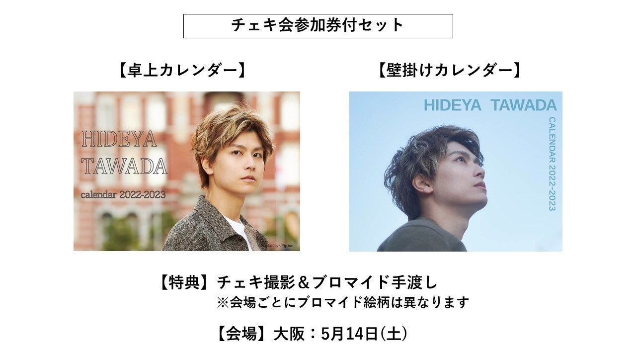 ●内容:2022年度のセパレート式A5卓上カレンダー、A4壁掛けカレンダー(見開きA3)セット(大阪チェキ会参加券付、会場手渡し特典ブロマイド)